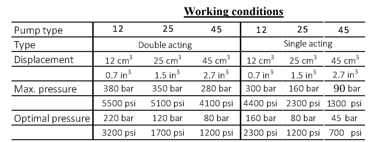Double Acting Optimal Pressure : 0.7 CID (3200 Psi) , 1.5 CID (1700 Psi), 2.7 CID (1200 Psi)